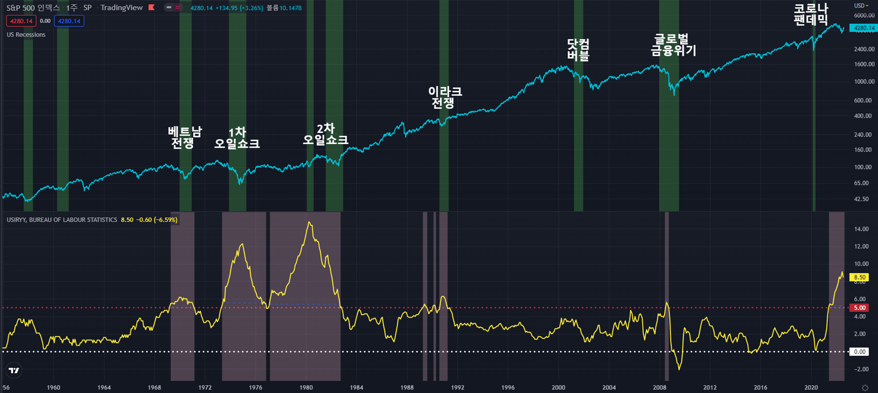 그래프를 보시면, 물가상승률이 5% 이상으로 올라가게 되면 언제나 경기침체를 겪은 뒤에야