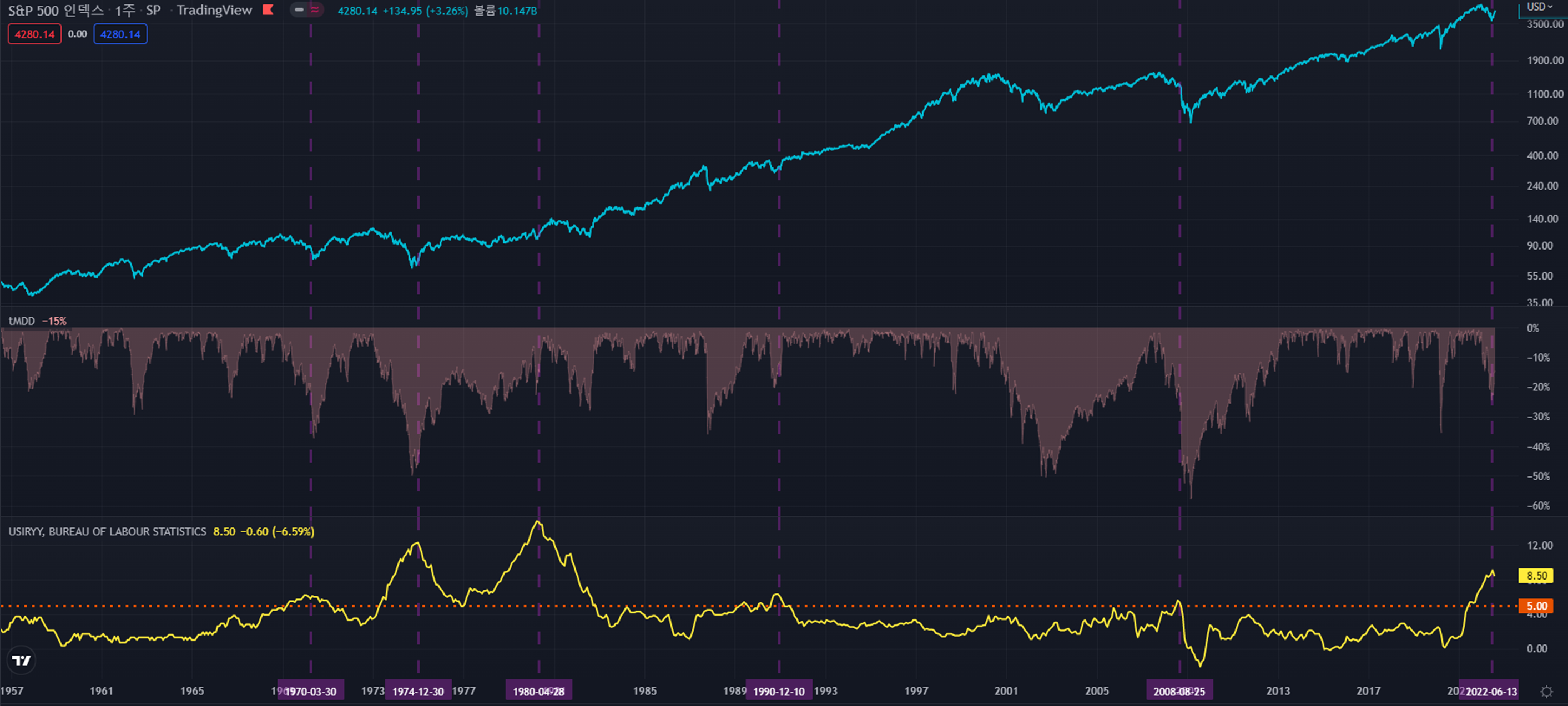 S&P 500 로그차트(하늘색), S&P 500 MDD%(분홍색), CPI YoY%(노란색)을 함께 그려놓았습니다.