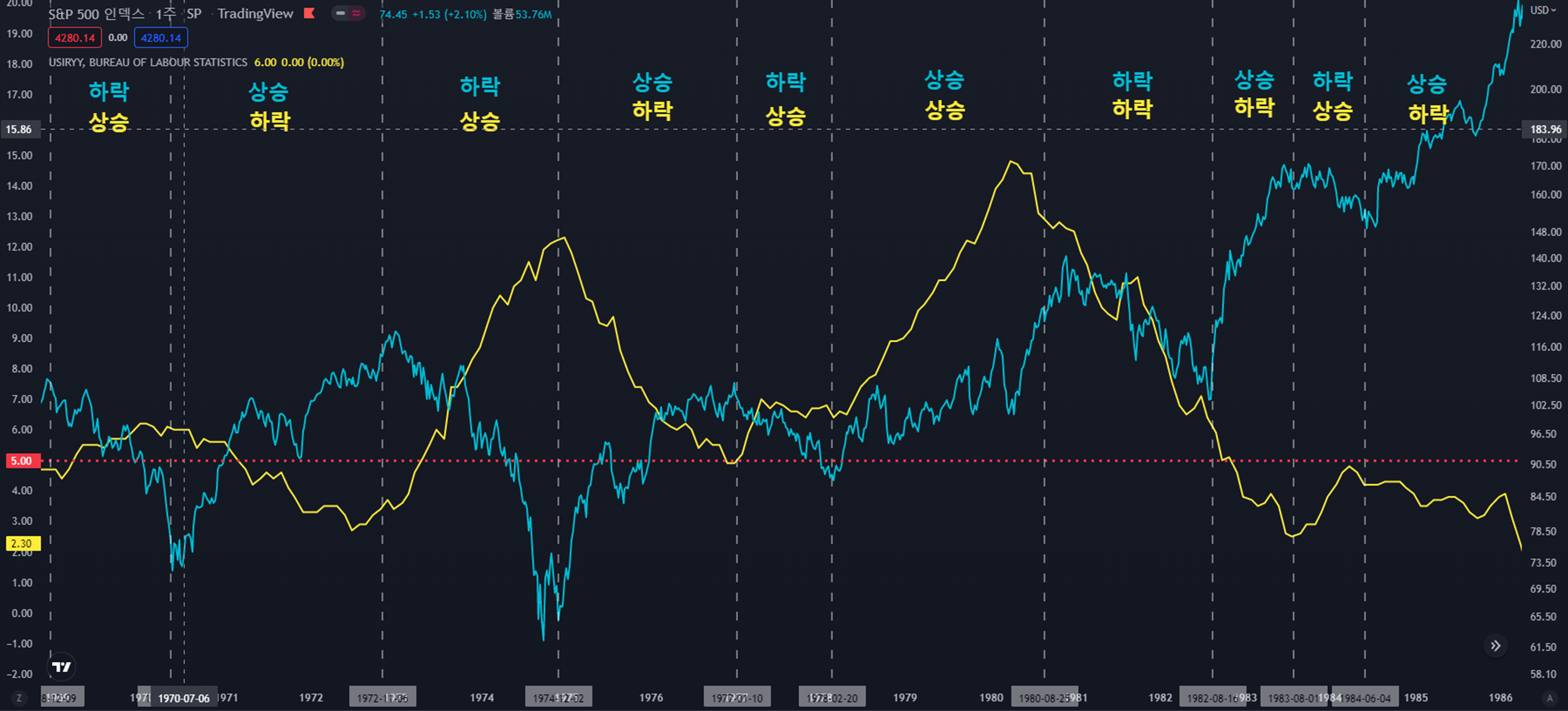 아래 그래프는 1969~1985년 사이 S&P 500 로그차트와 CPI YoY% 차트를 겹쳐 그려놓은 그래프입니다.