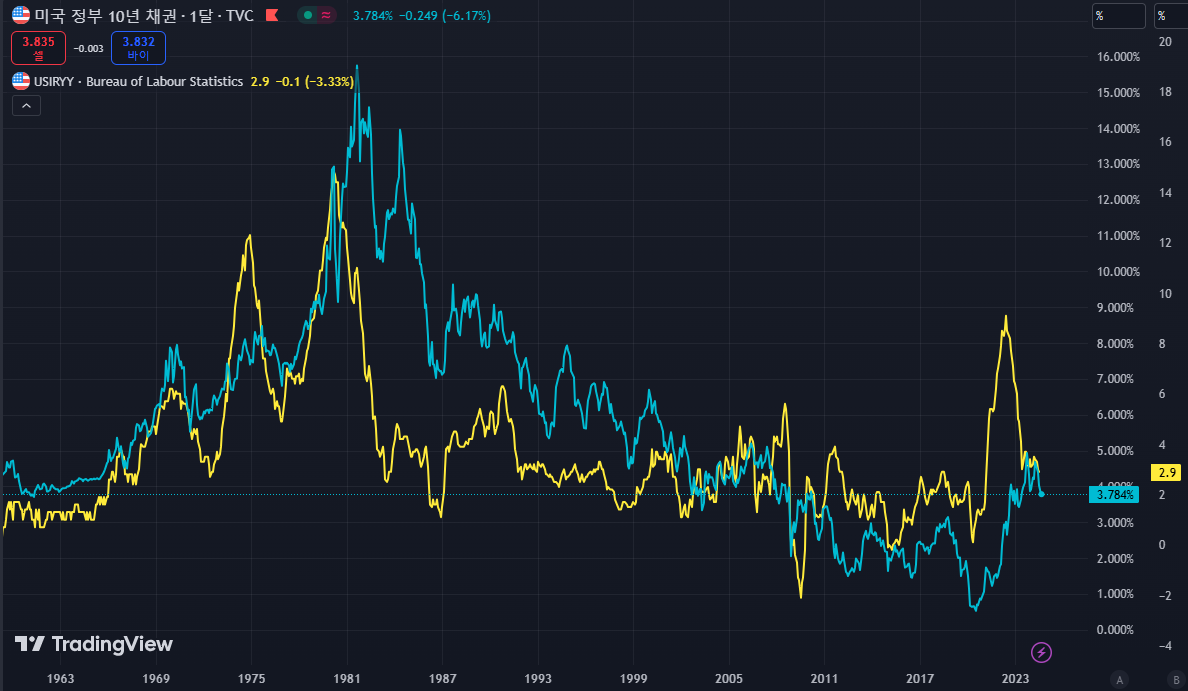 아래 그래프에서 CPI YoY%(노란색)와 미국채 10년물 금리(하늘색) 두 차트는