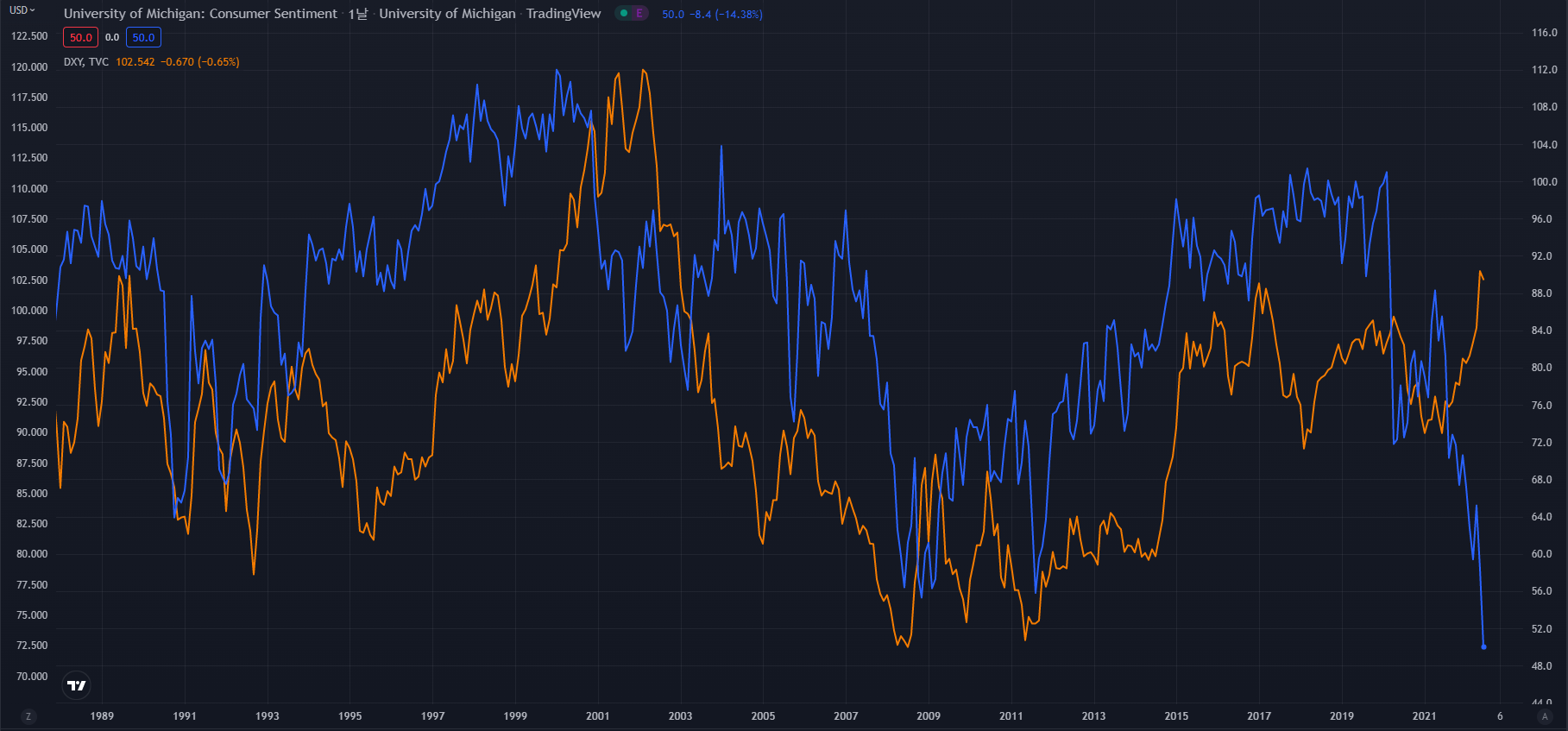 아래 그래프는 1988년부터 현재까지의 CSI(파란색), 달러인덱스(주황색) 차트입니다.