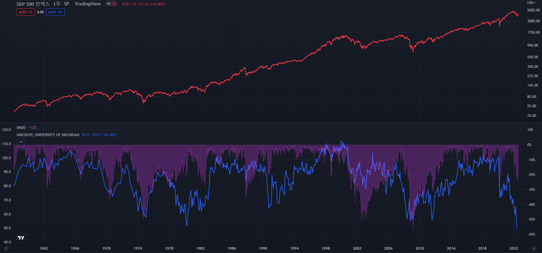 밑의 파란색 차트는 CSI, 보라색 영역차트는 S&P500의 MDD(고점대비 최대하락율)입니다.
