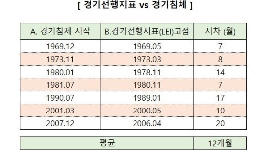 아래 표는 경기침체가 시작된 시점과 LEI가 고점을 찍은 시점의 시차를 나타낸 표입니다.