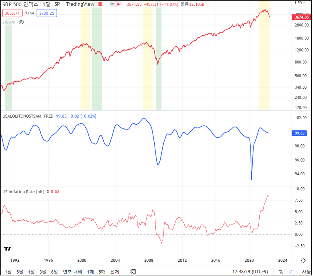아래 그래프는 위에서부터 차례로 S&P 500 (로그), 미국 CLI, 미국 CPI 차트입니다.