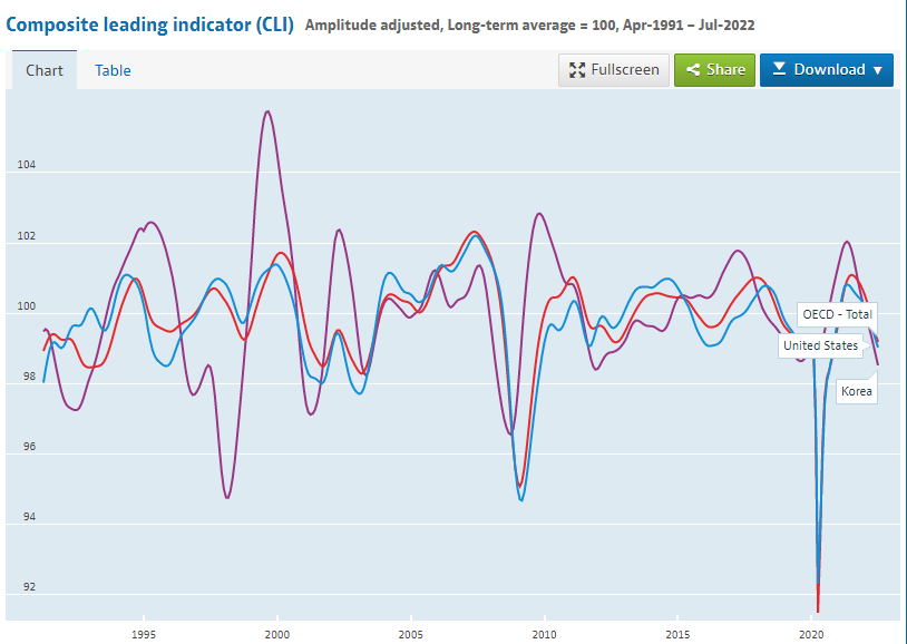 경기선행지수 중 하나가 OECD에서 발표하는 CLI(Compostie Leading Indicator)입니다.