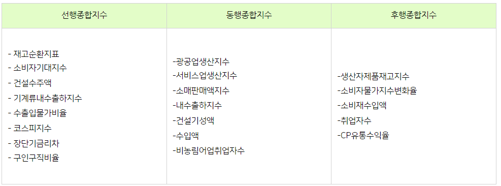 경기종합지수를 구성하는 선행지수, 동행지수, 후행지수의 각 구성요소는 아래 표와 같습니다.