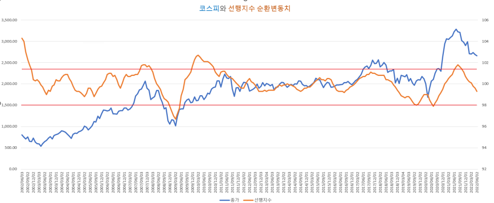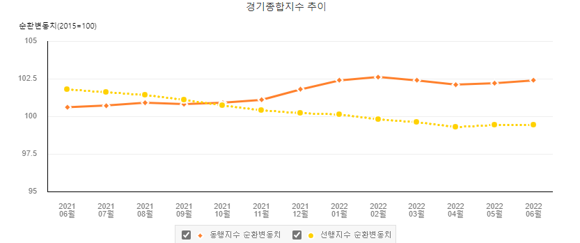 가장 최근 발표된 22년 6월 선행지수 순환변동치가 99.4인 것을 고려하여 아래 차트에 대입하면