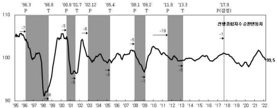 그래프를 보면 선행지수 순환변동치의 고점과 저점에서부터 경기침체구간에 집입 또는 탈출하기까지의