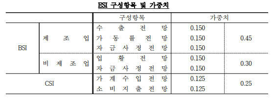 비제조업 자금사정전망)과 CSI 2가지(가계수입전망, 소비지출전망)로 이루어집니다.