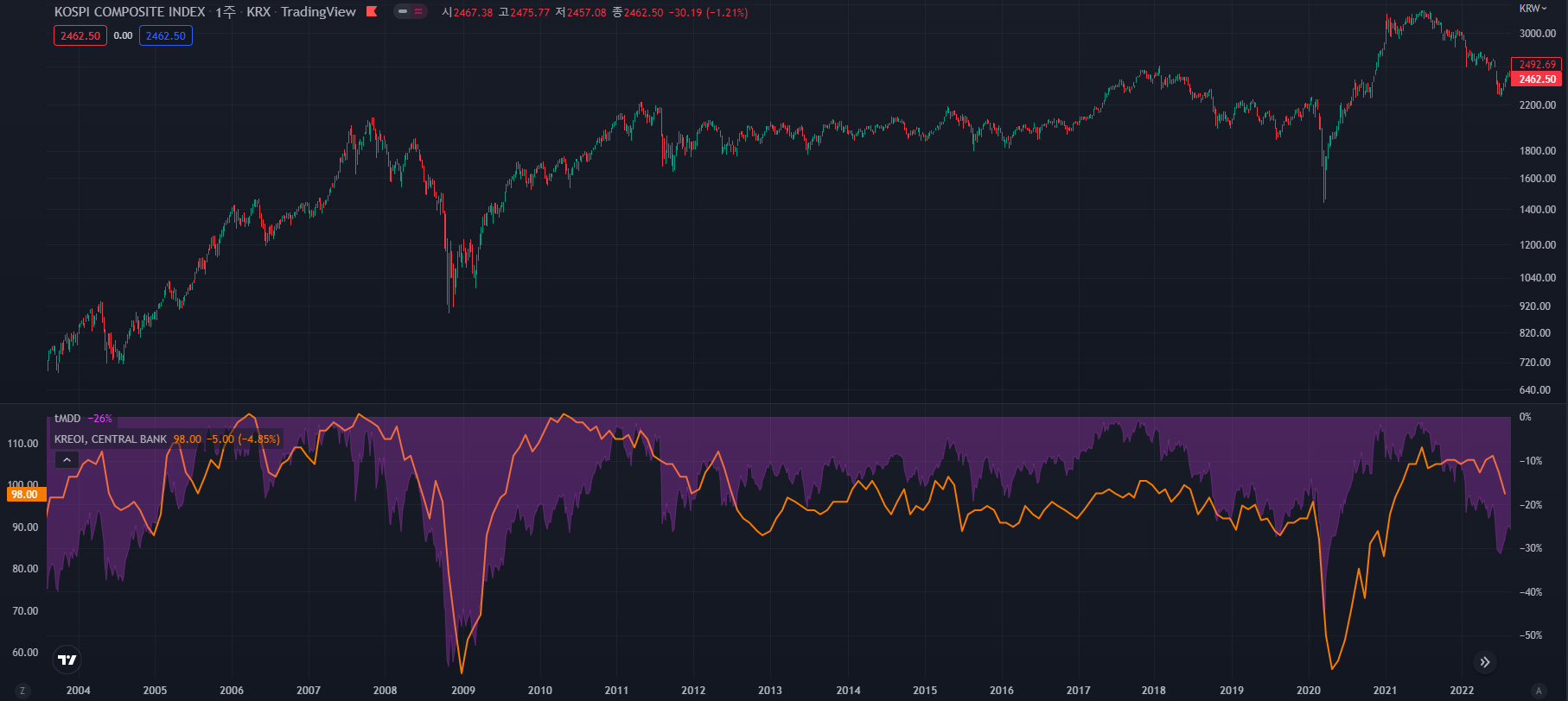 밑의 주황색 차트는 ESI(원계열) 차트, 보라색 영역차트는 KOSPI의 MDD(고점대비 최대하락율)입니다.