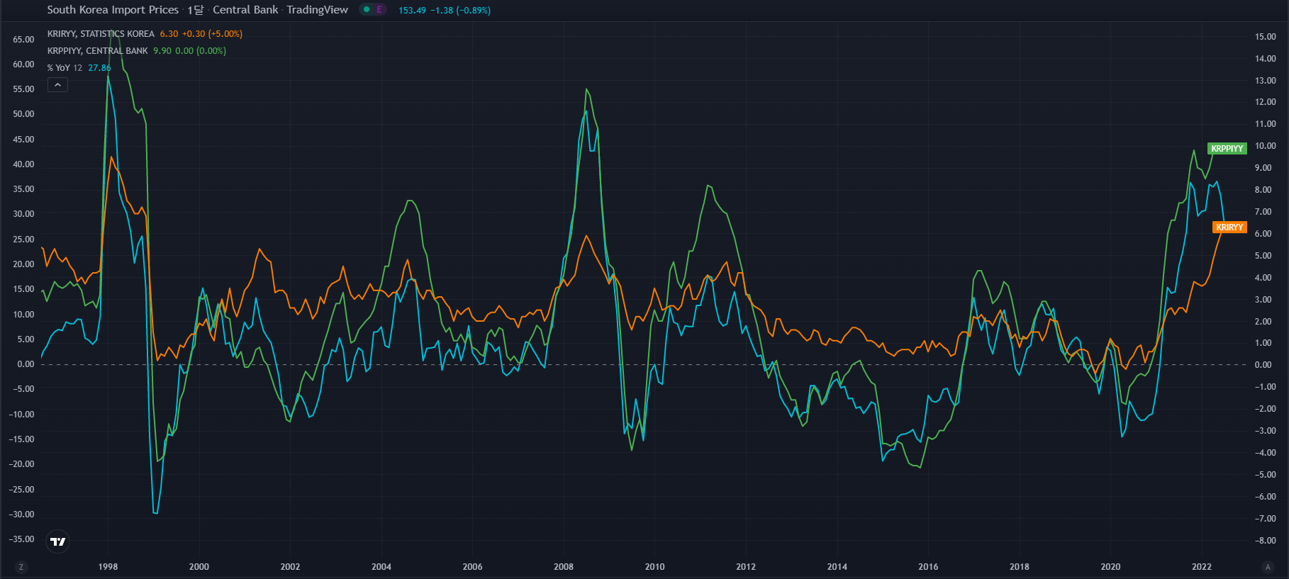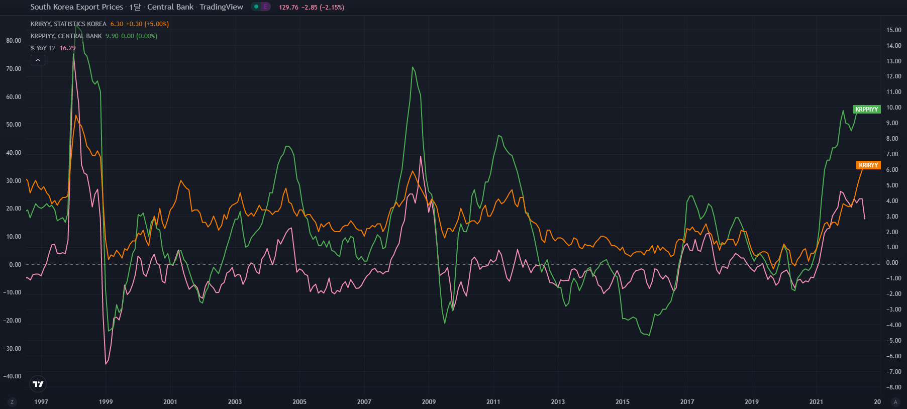 수입물가지수는 PPI와 연관성이 좀 더 높고, 수출물가지수는 CPI와 연관성이 더 높아 보이네요.