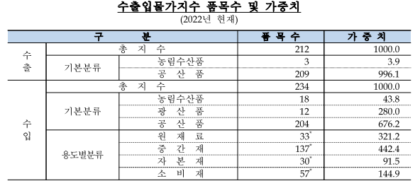 2022년 현재 기준 수출품목으로는 212개, 수입은 234개 품목에 대하여 조사하고 있습니다.