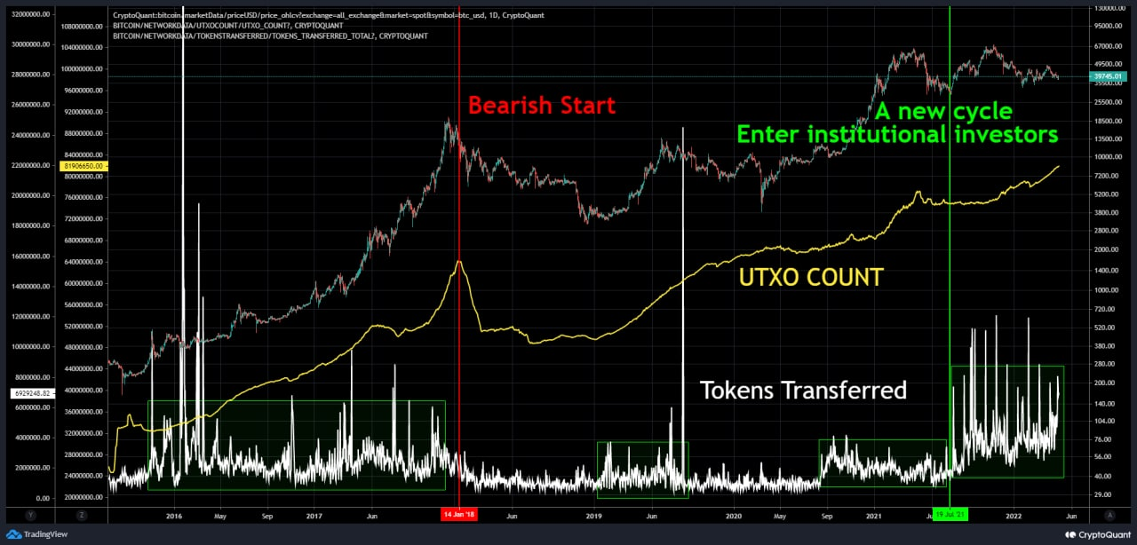 즉, 본격 하락장이 시작될때는 UTXO가 감소하는 모습이 나타나는 경우가 종종 나타납니다.
