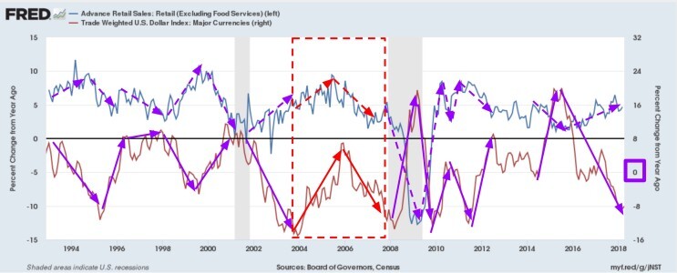 세계 경기가 둔화될 때 미국의 소매판매는 당연히 줄어드는 경향을 보이며