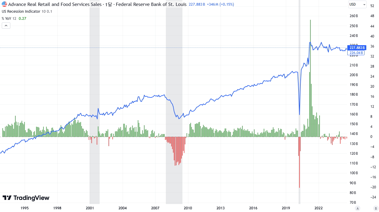 아래 그래프에서 파란색 선은 실질 소매판매액이며, 막대 그래프는 실질소매판매액의 YoY%를 나타냅니다.