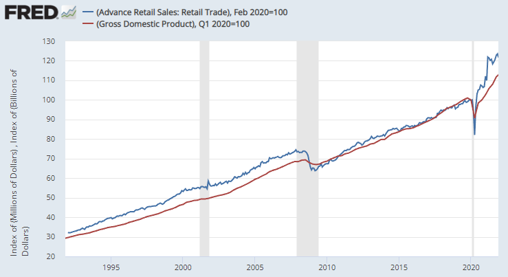 미국 GDP에서 소비가 70%를 차지하는만큼 아래 그래프처럼 GDP(빨간색)와 소매판매액(파란색)은