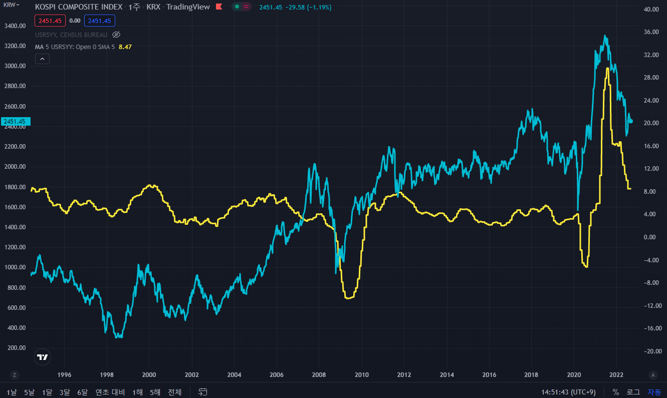 그로 인해 KOSPI 지수(하늘색)와 미국 소매판매 YoY%의 5주 이동평균선(노란색) 간에도
