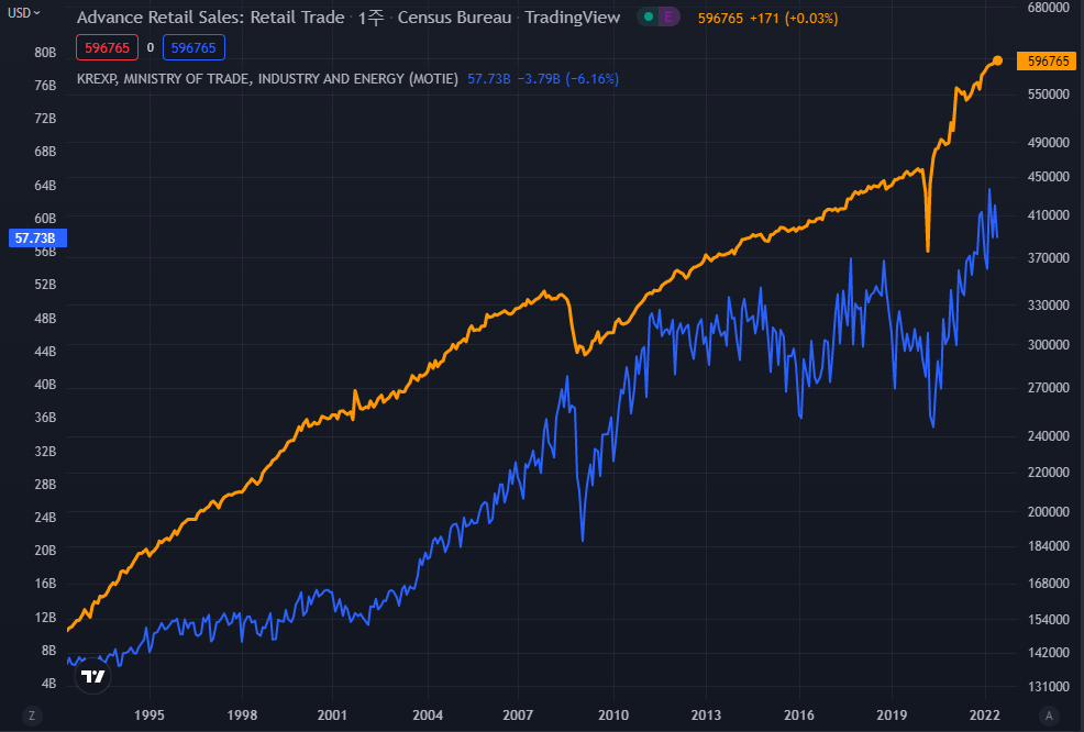 따라서 한국의 수출액(파란색)과 미국의 소매판매액(주황색) 간에는 높은 상관관계를 보입니다.