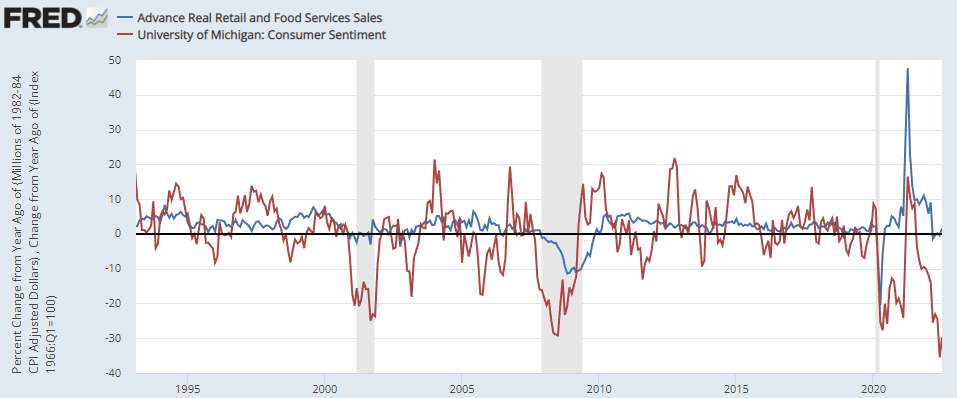 소매판매지수 YoY%(파란색)가 CSI(빨간색)을 다소 후행하여 움직이는 경향입니다.
