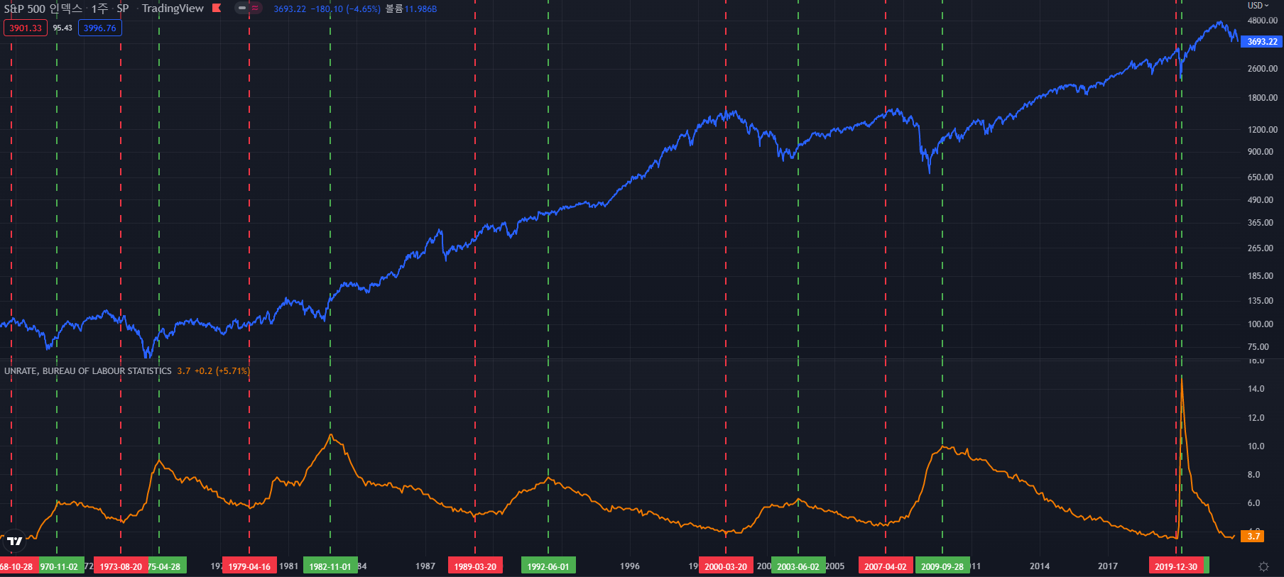 두번째 그래프에서 봐도 S&P 500(파랑)의 피크에선 실업률(주황)의 저점(빨강) 부근인 경우가 많았고