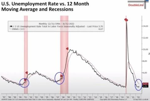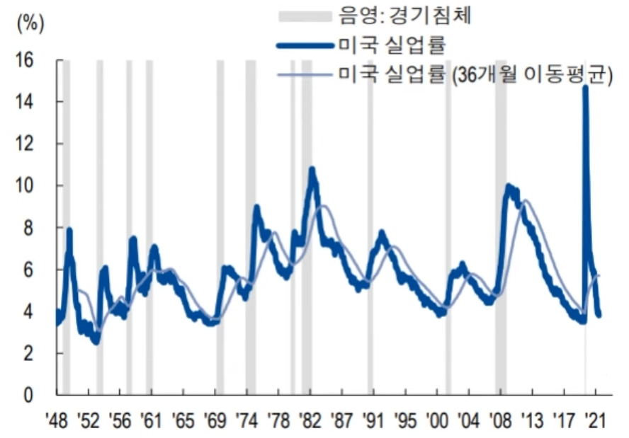 이동평균선을 기준으로 보면 실업률이 12개월 이동평균선을 상향돌파하면 몇 달 뒤에 경기침체가 따라오는