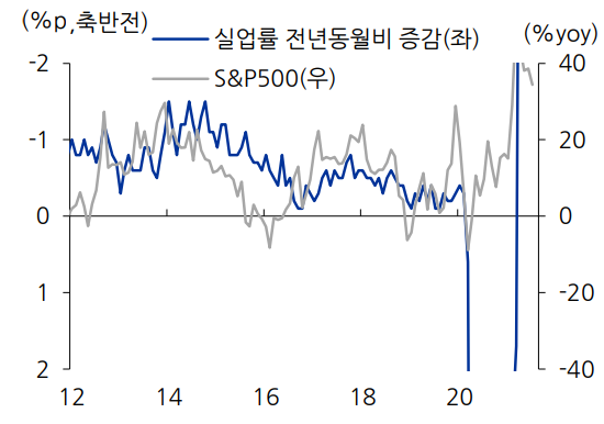 이는 실업률이 주가의 방향과 반대 방향으로 후행하는 것을 의미합니다.
