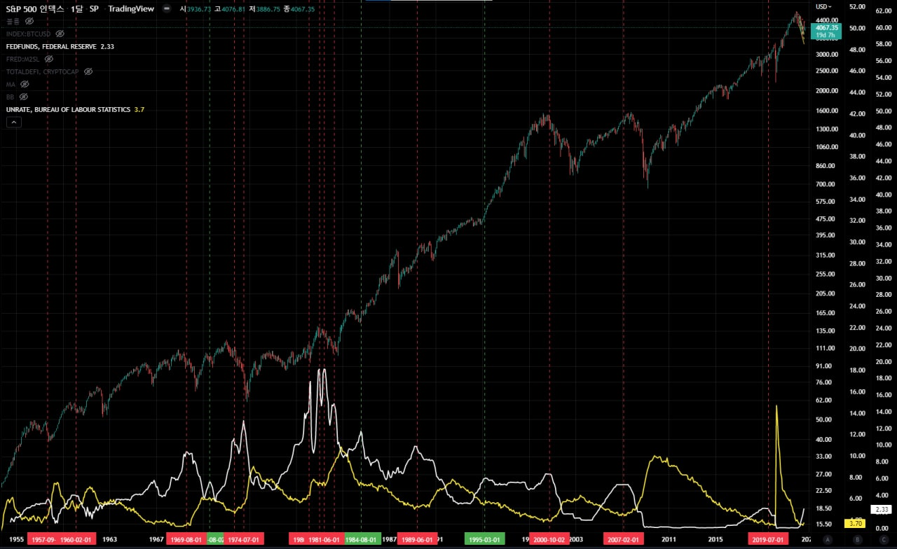 아래 그래프의 캔들차트는 S&P 500, 흰 라인차트는 기준금리, 노란 라인차트는 실업률에 해당합니다.