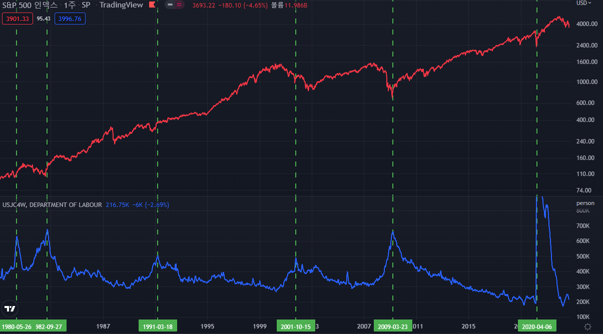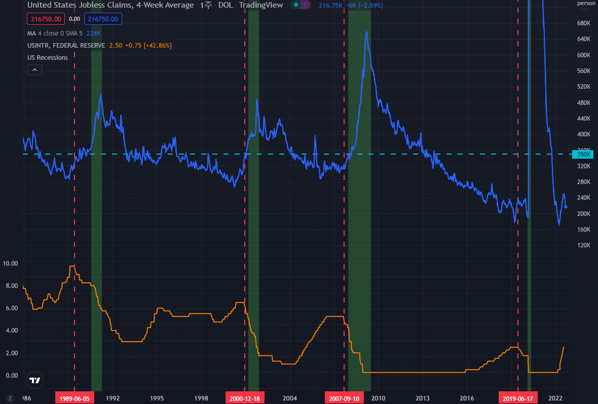 통상적으로 신규 실업수당 청구건수가 350K를 넘게되면 연준은 더 이상 기준금리를 인상하지 못하고