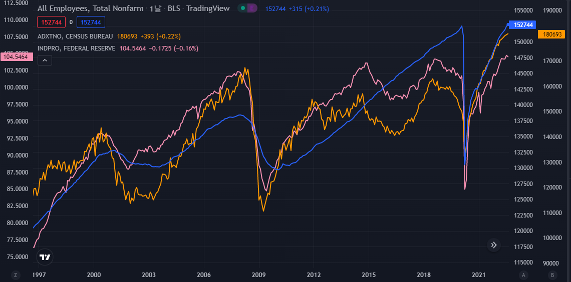 비농업고용지수(파란색) 순으로 1~2개월 정도 선행하는 경향성을 확인할 수 있습니다.