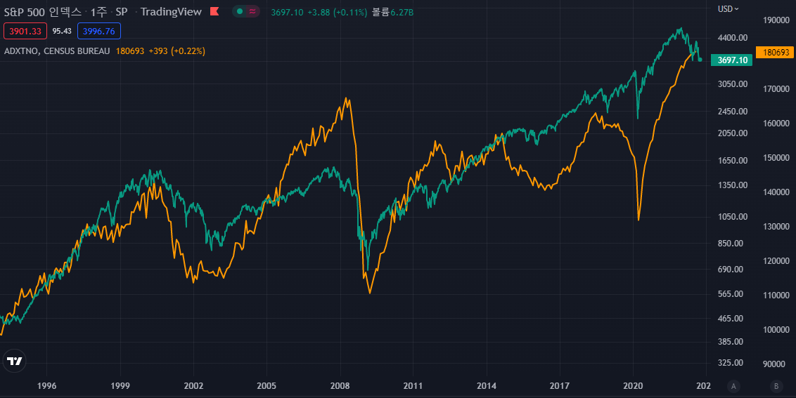 다음은 S&P 500 주가지수(초록색)와 근원 내구재주문지수(주황색)를 비교한 그래프입니다.