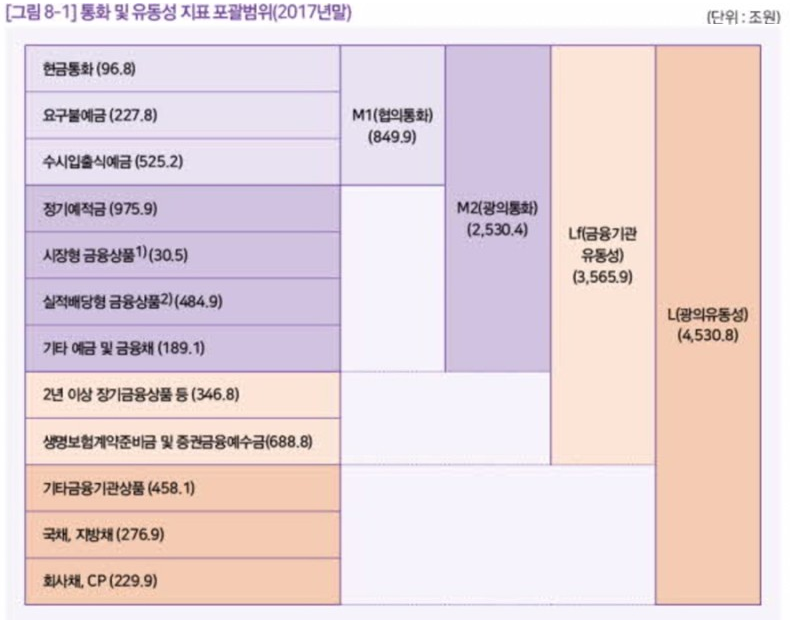 - M2 (광의통화): M1 + 저축성, 단기 예금 등 (만기 2년 미만의 비교적 단기간내에 사용 가능한 돈)