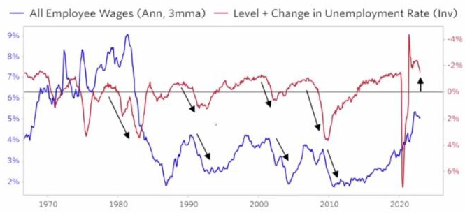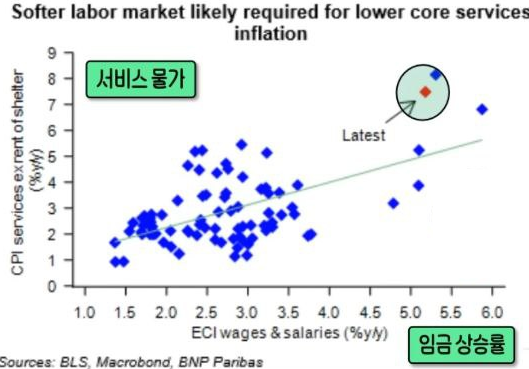 고용이 불안정해지더라도 임금상승률이 낮아질 때까지 연준은 긴축 기조를 유지할 확률이 높을 의미합니다.