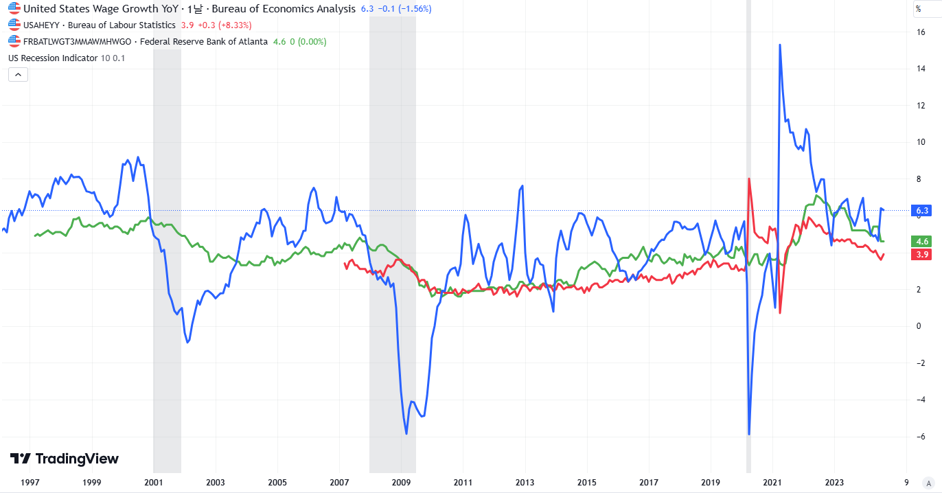 미국의 임금과 관련된 주요 지표로는 경제분석국(BEA)에서 발표하는 임금 성장률(Wage Growth)과