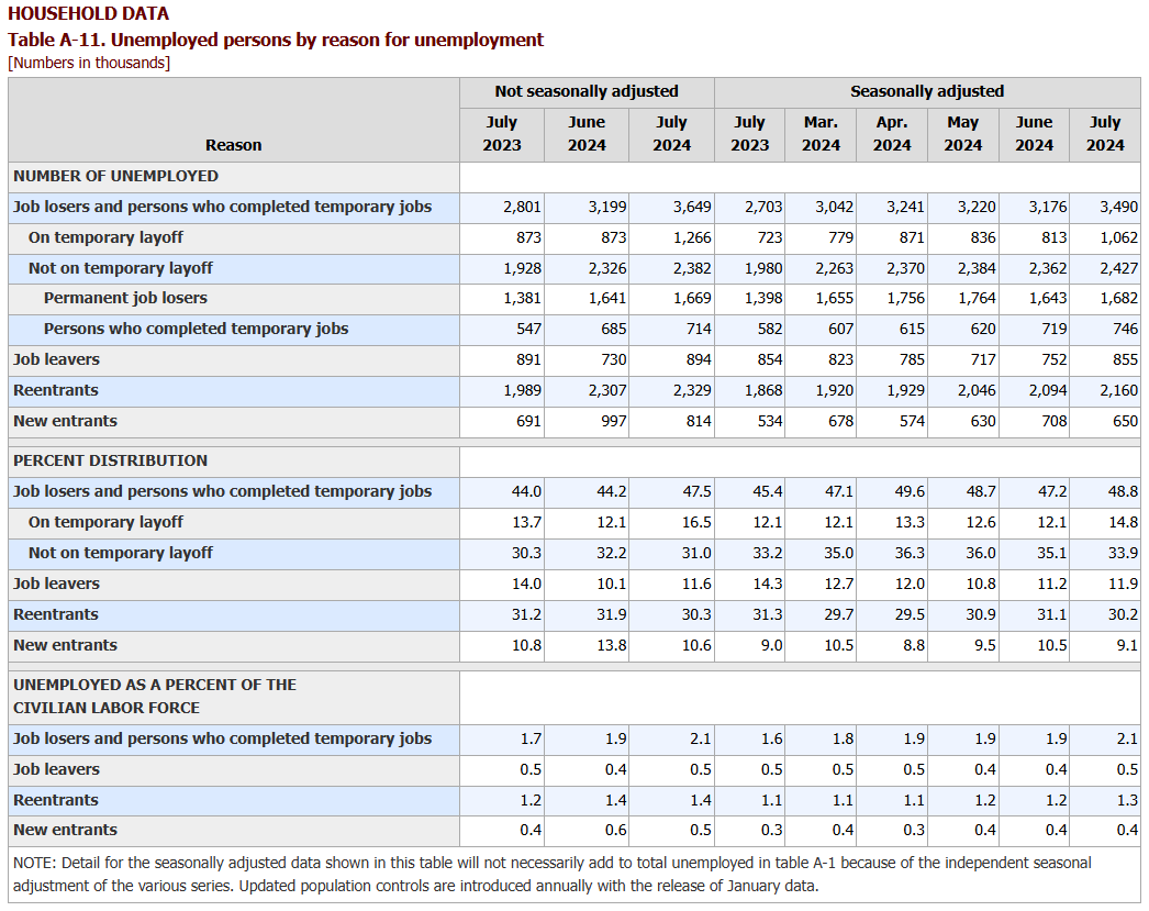 실업 원인에 대한 고용보고서 표의 경우는 구글에 'BLS Table A-11'을 검색하면 쉽게 찾을 수 있습니다.