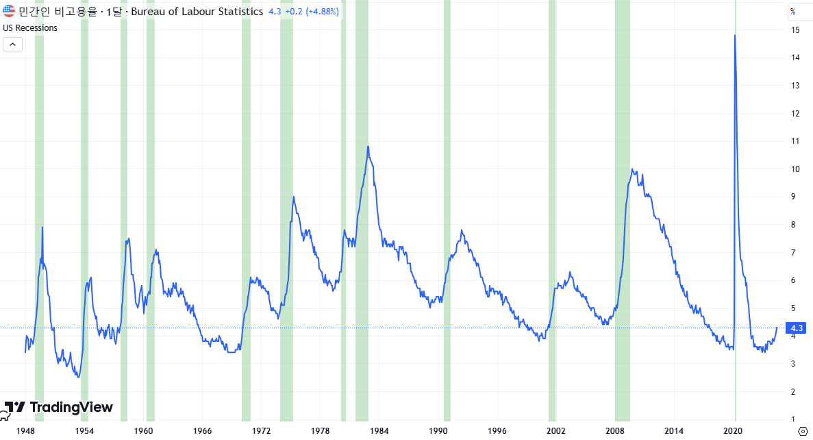 아래 그래프에서 보아도 파란색 차트인 실업률은 초록색 영역인 경기침체에 들어가기