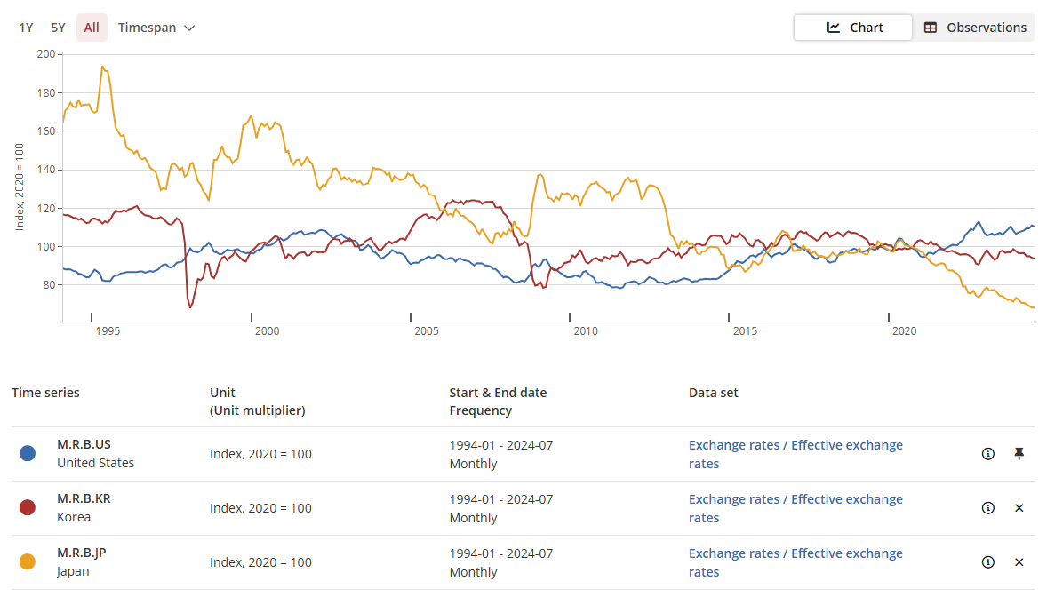 각국의 명목/실질 실효환율은 하기 BIS(국제결제은행) 사이트에서 확인할 수 있습니다.