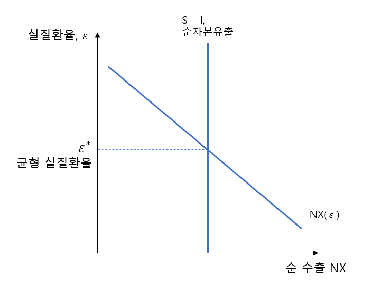 따라서 순수출과 실질환율은 다음과 같이 음의 관계를 나타냅니다.