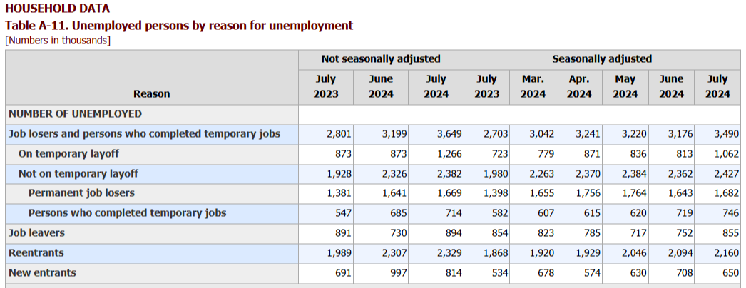 실업 원인에 대한 BLS 고용보고서 표의 경우는 구글에 'BLS Table A-11'을 검색하면 쉽게 찾을 수 있고