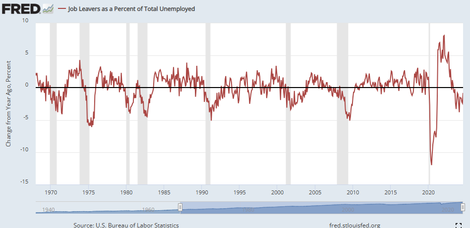 아래 그래프는 전체 실업 중 퇴사가 차지하는 비중이 전년 대비 얼마나 증가하였는지(YoY%)를 보여줍니다.