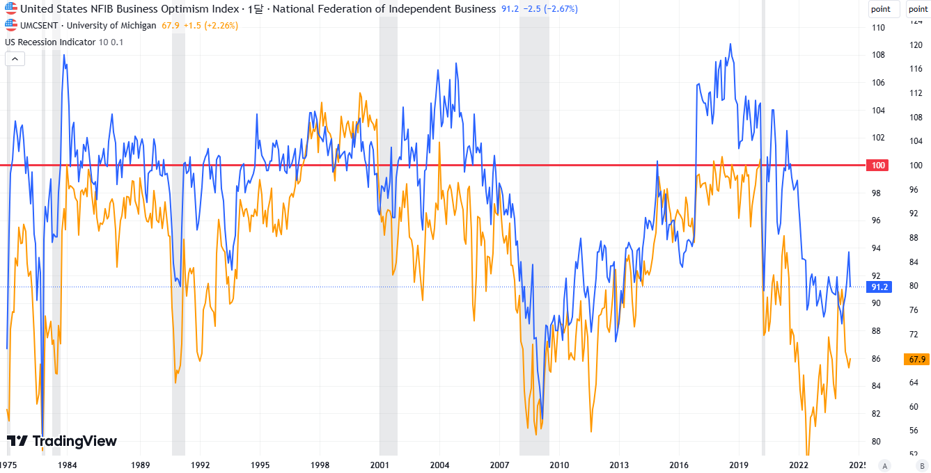 개인적으로 NFIB 소기업 낙관지수(파란색)가 경기에 대한 선행지표로써 정확성이 높다고 판단합니다.
