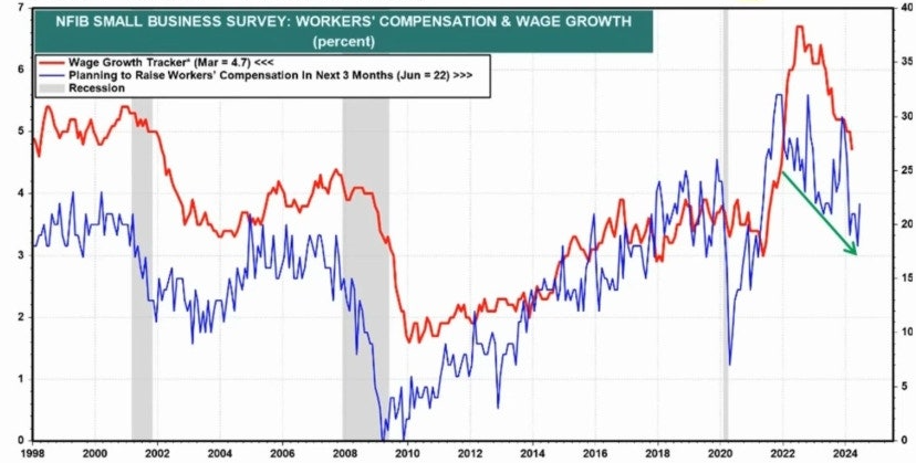 NFIB 직원 보상 계획 지표는 임금 상승률에 6~9개월 선행하는 모습을 확인할 수 있습니다.