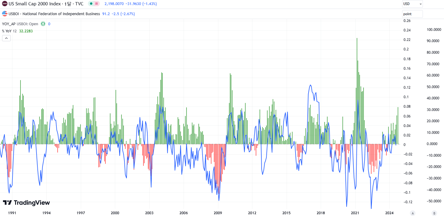 아래는 Russell 2000의 YoY%(막대그래프)와 NFIB 소기업 낙관지수의 YoY%(선그래프)를 나타낸 차트로
