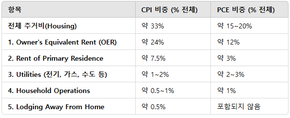 미국의 대표적인 물가지수인 CPI와 PCE에서 주거비는 각각 전체의 33%, 17% 수준을 차지하고 있습니다.