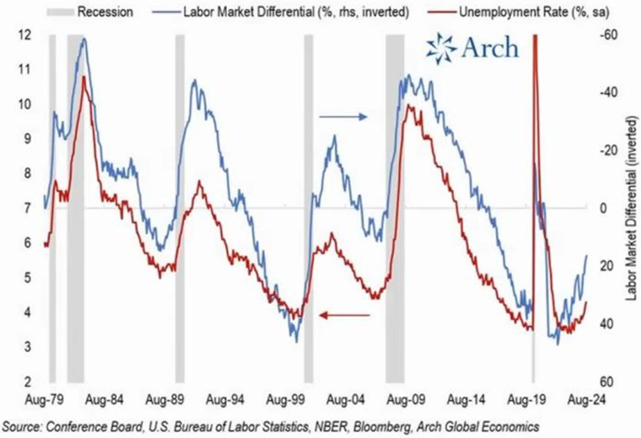 과거 경기침체 구간에선 노동차등지수의 하락(파란색 차트 상승)이 먼저 나온 후 실업률이 상승하기 시작하고
