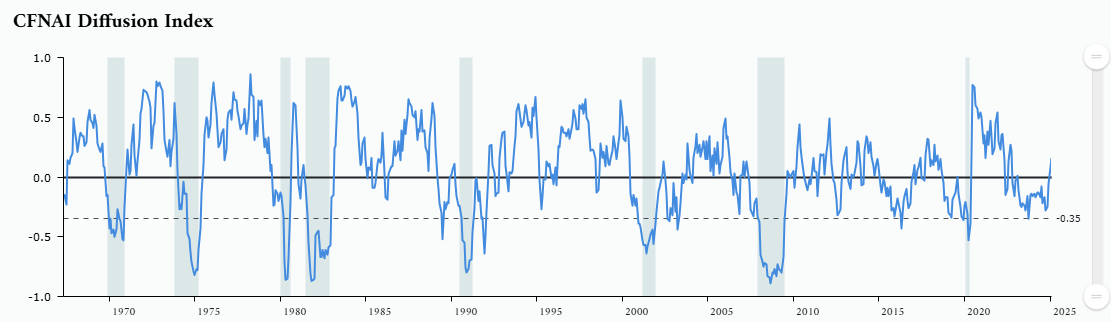 역사적으로 CFNAI 확산 지수가 -0.35 이하로 떨어질 경우, 향후 경기 침체로 이어졌 사례가 많습니다.