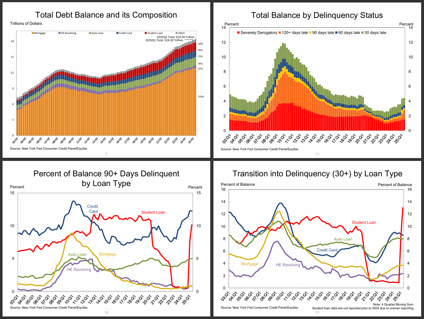 신용카드 연체는 고점을 지나 다소 안정화되는 흐름이지만 모기지와 HELOC는 완만한 상승세가 지속 중입니다.