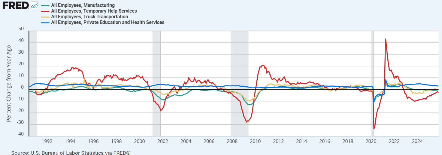 실제로 경기 민감도가 높은 제조업, 임시직 도움 서비스, 트럭 운송업 등은 고용 둔화가 지속되고 있습니다.