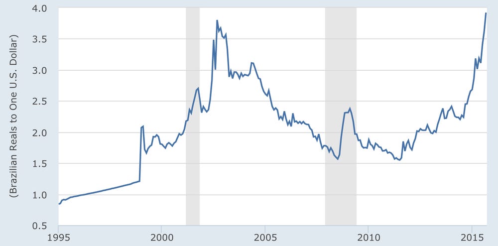 헤알화-달러 환율이 1995년부터 2015년까지 4배 이상 오른 수준입니다.