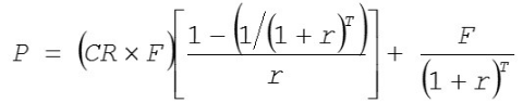 P는 채권가격, CR은 표면금리, F는 액면가, T는 만기까지 남은 년수(듀레이션), r은 만기수익률을 나타냅니다.