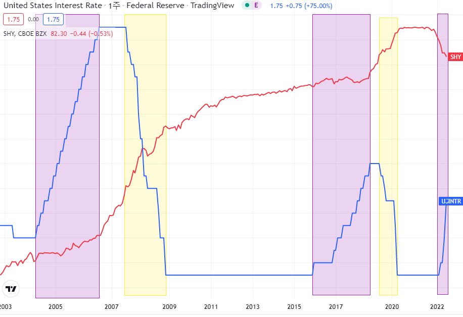 첫번째 그래프를 보시면 금리인상기인 보라색 영역에는 SHY(미국 단기국채 ETF) 가격이 횡보 또는 하락하며